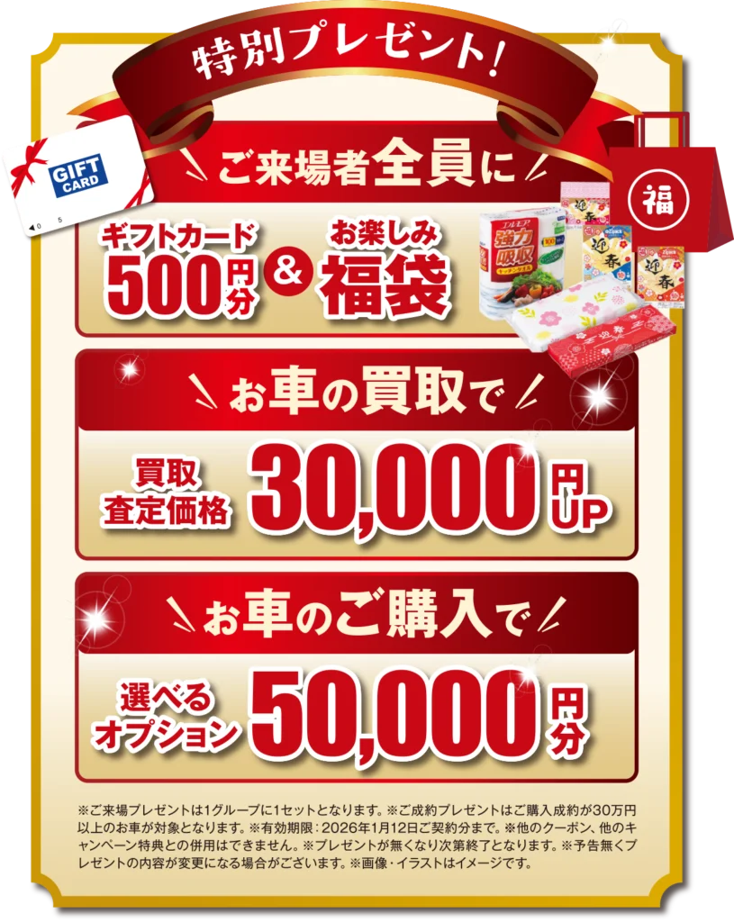 ご来場、買取ご成約、ご購入ご成約のお客さまにプレゼントもご用意しております!